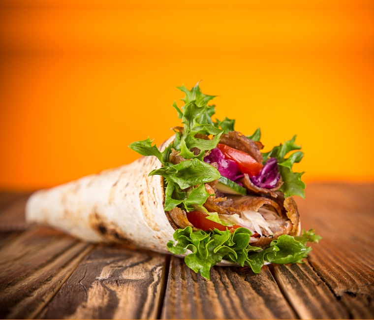 Piadina fatta al momento con carne di kebab, verdure e salse a scelta.